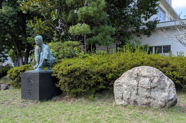番町小学校の正門には子規が箱根を目指して草履のひもを結んでいる旅立ちの像と、